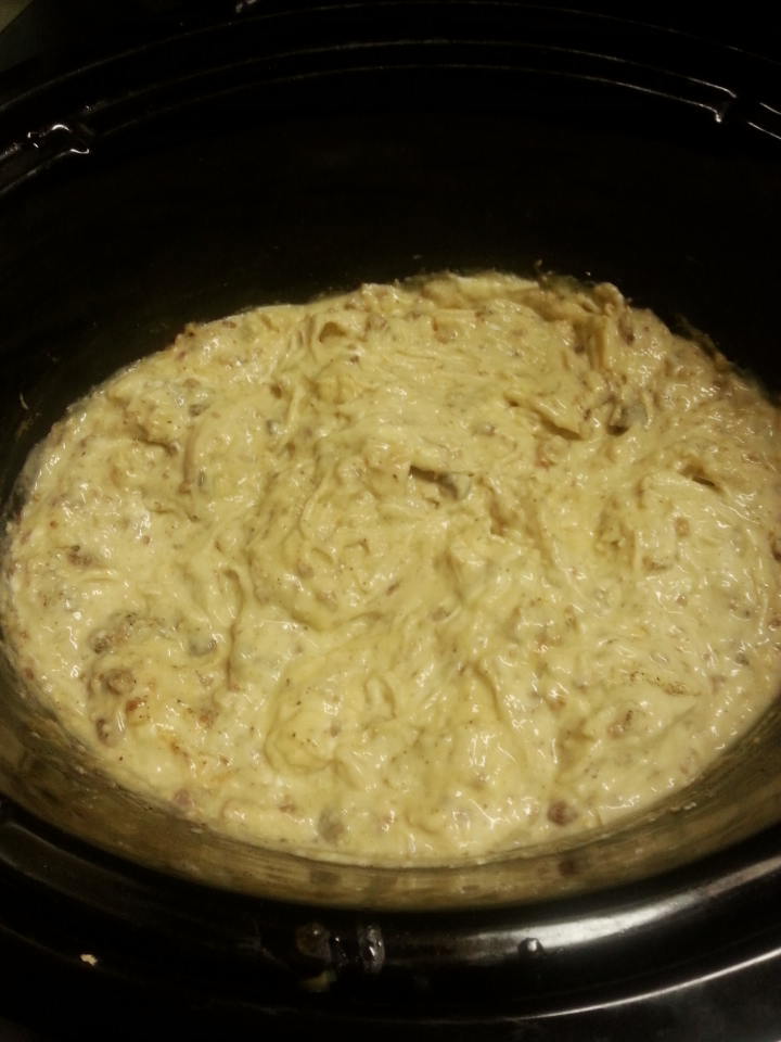To the soup in the crock pot, add cut cream cheese, the Italian seasoning and bacon bits and mix well until cream cheese is melted and all is blended together. Add chicken and let simmer on Low in crockpot while cooking pasta.