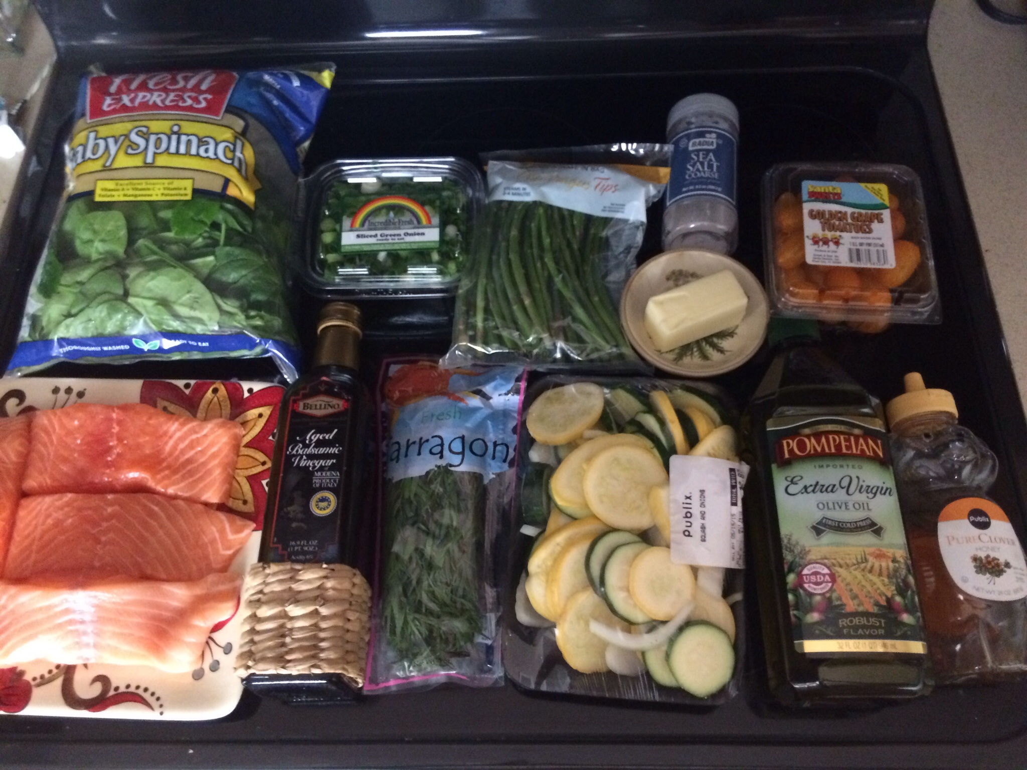 Arrange vegetables over each center of parchment as shown above. Add tarragon sprigs (2-3 per parchment)