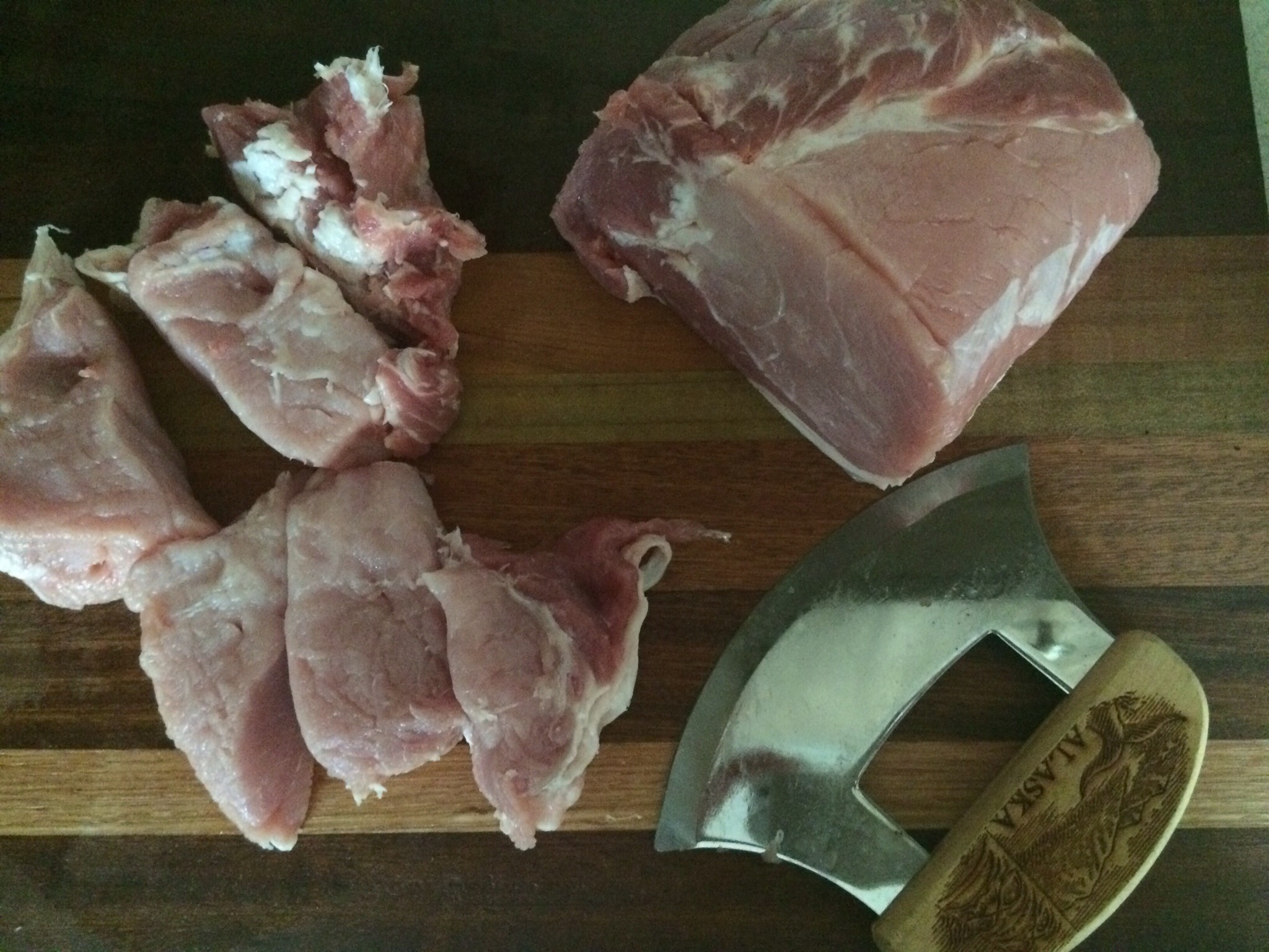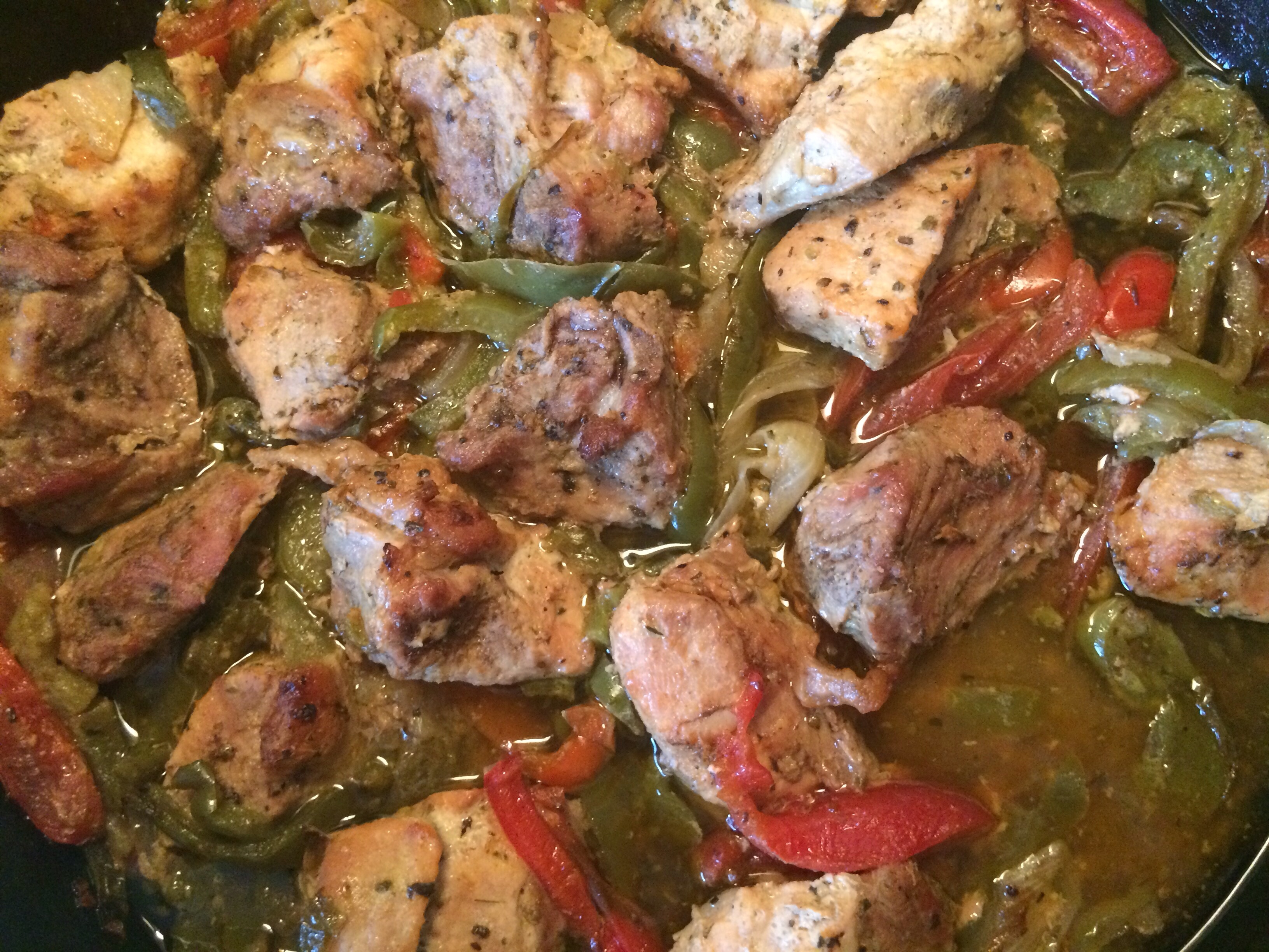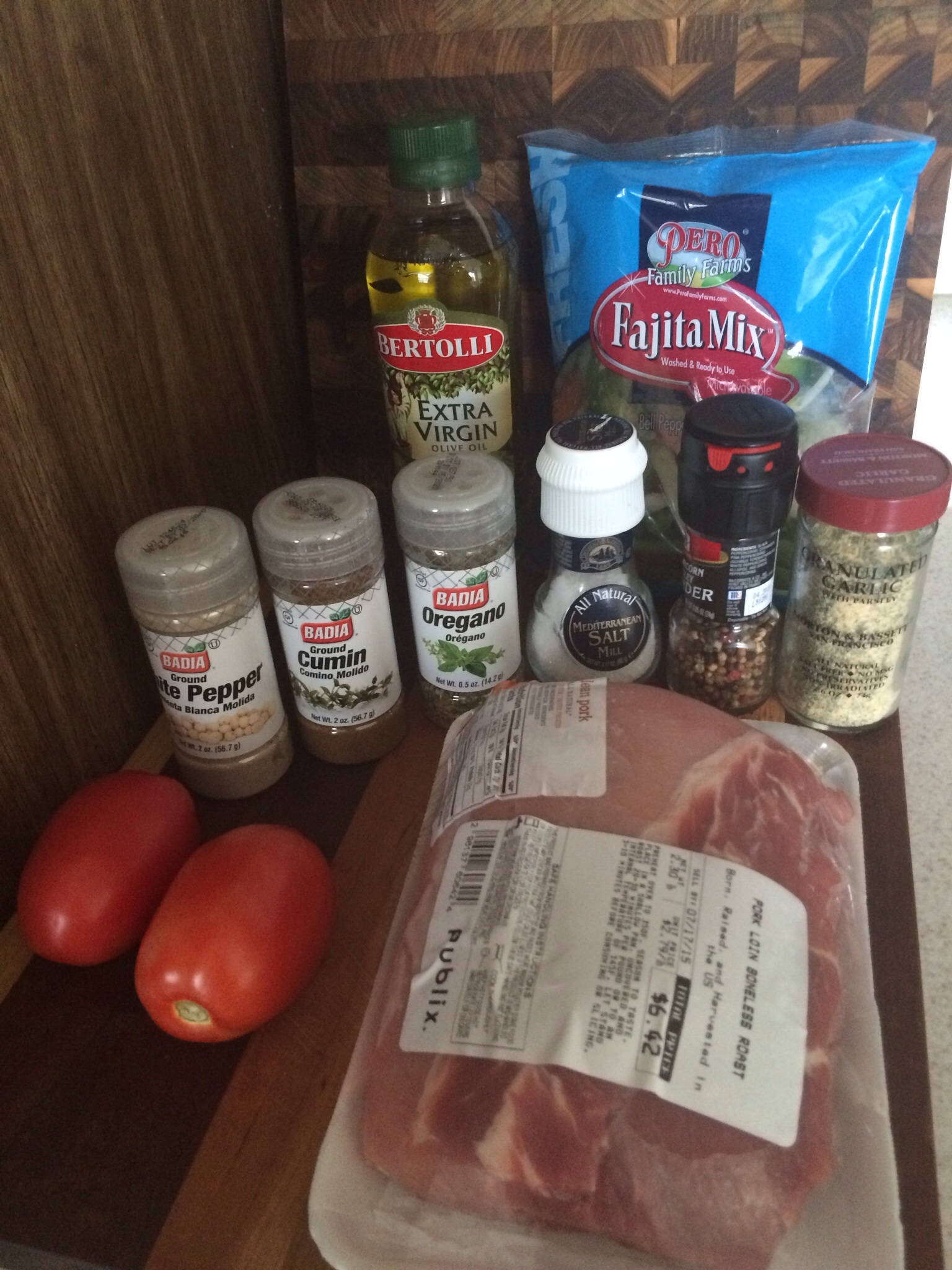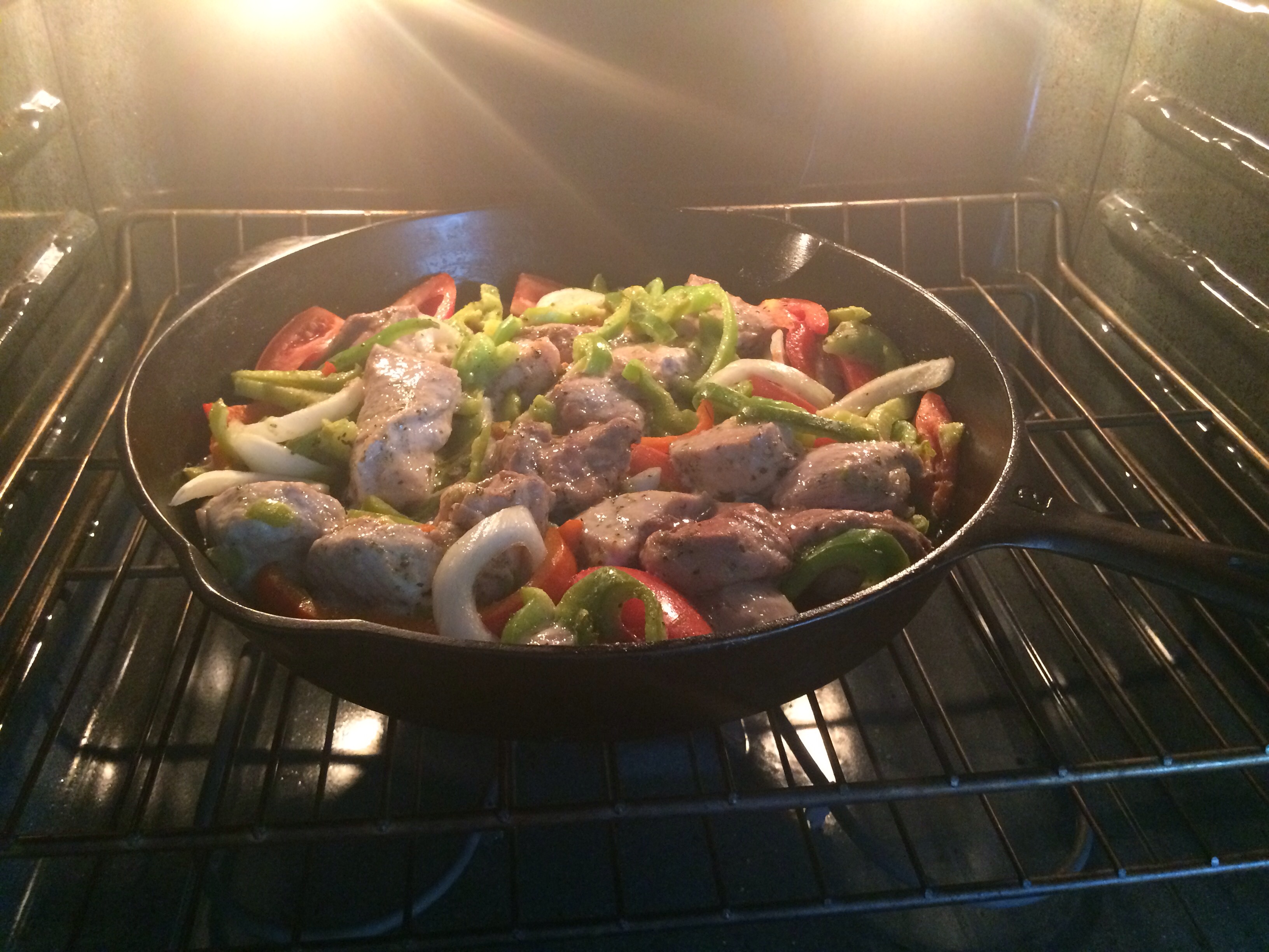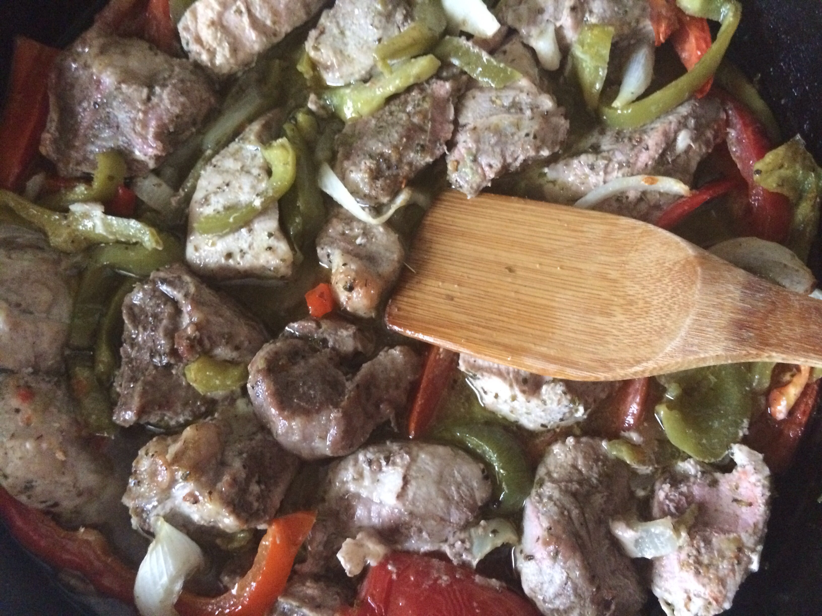 Cut up pork into large chunks. Add to a large skillet. Add fajita pepper mix to skillet.