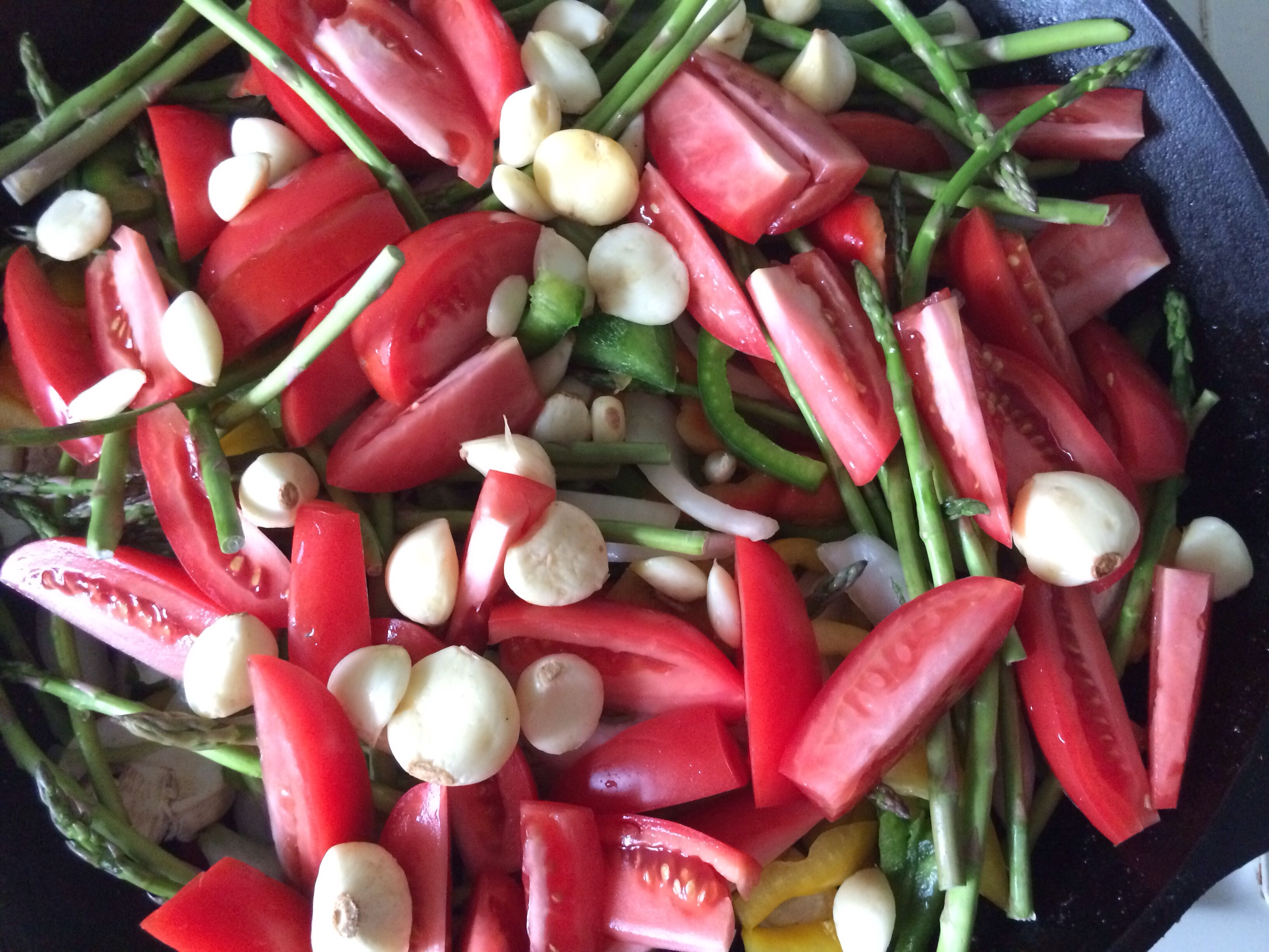 Assorted raw vegetables (peppers, onion, mushrooms, asparagus and plumb tomatoes used in this recipe)