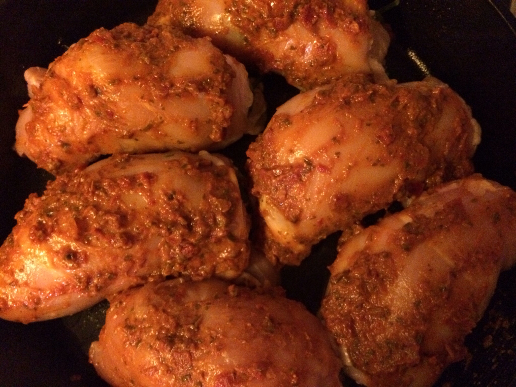 Add about 1/2 tsp pesto and using a separate spoon than dipping, spread evenly over chicken.