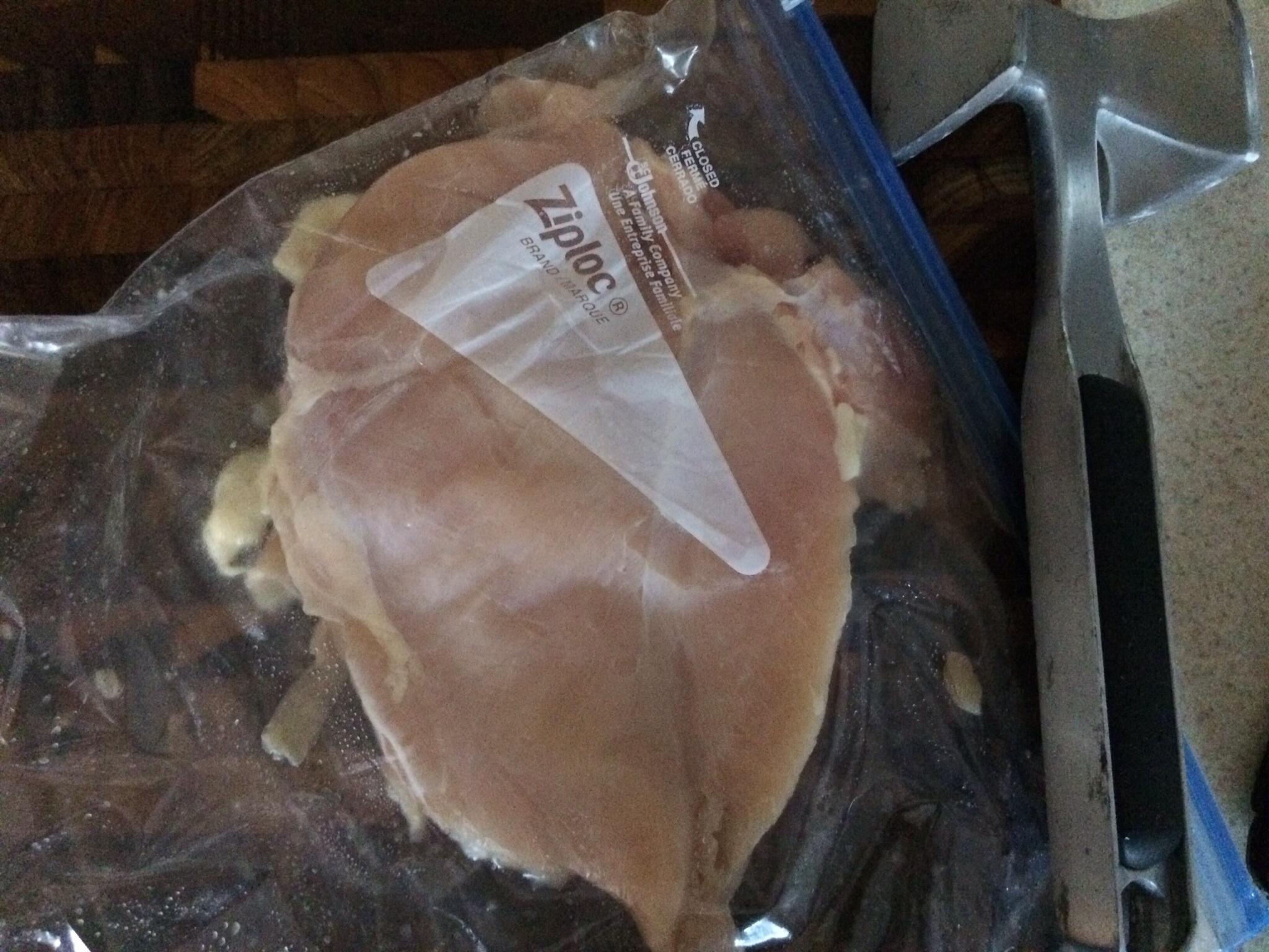 Place each chicken breast in a plastic zip-lock bag. Using a mallet, pound each to 1/4″ thickness.