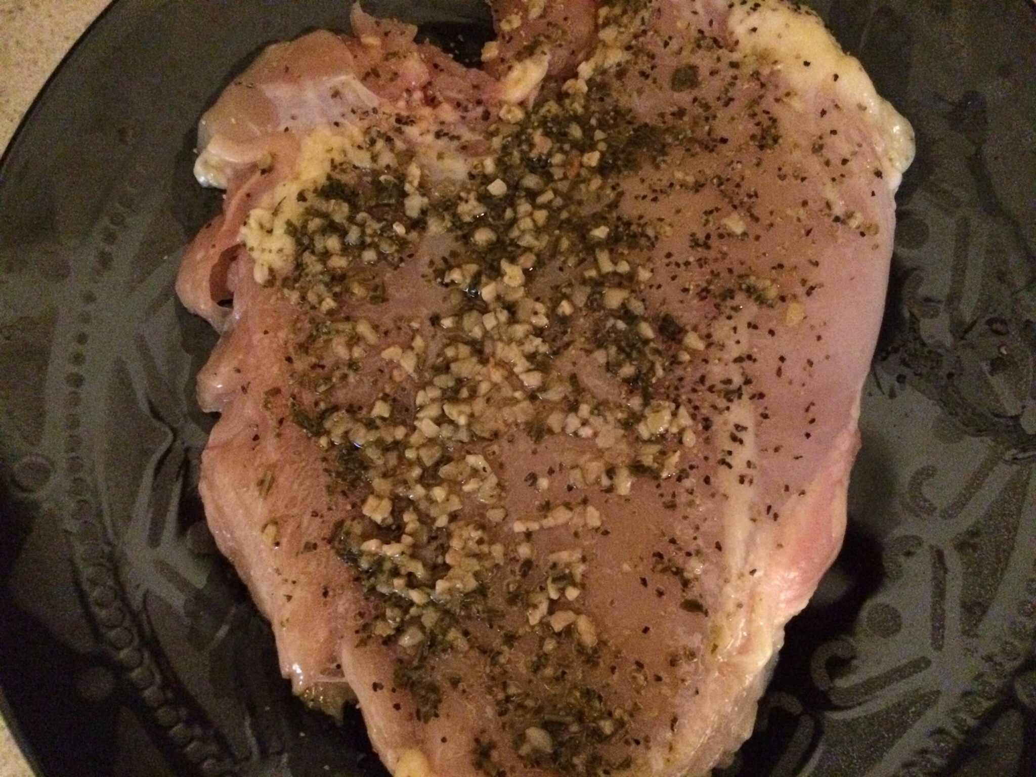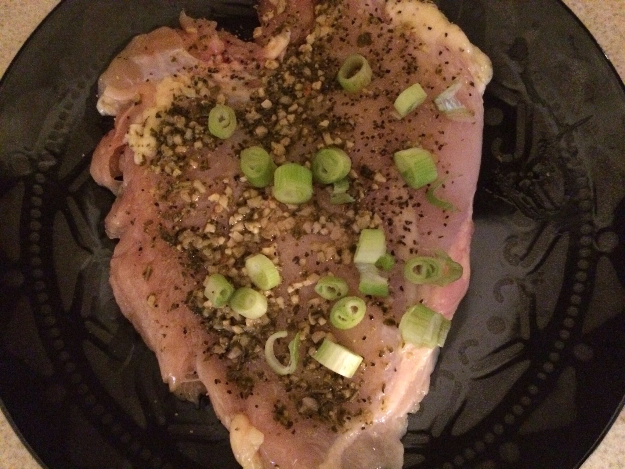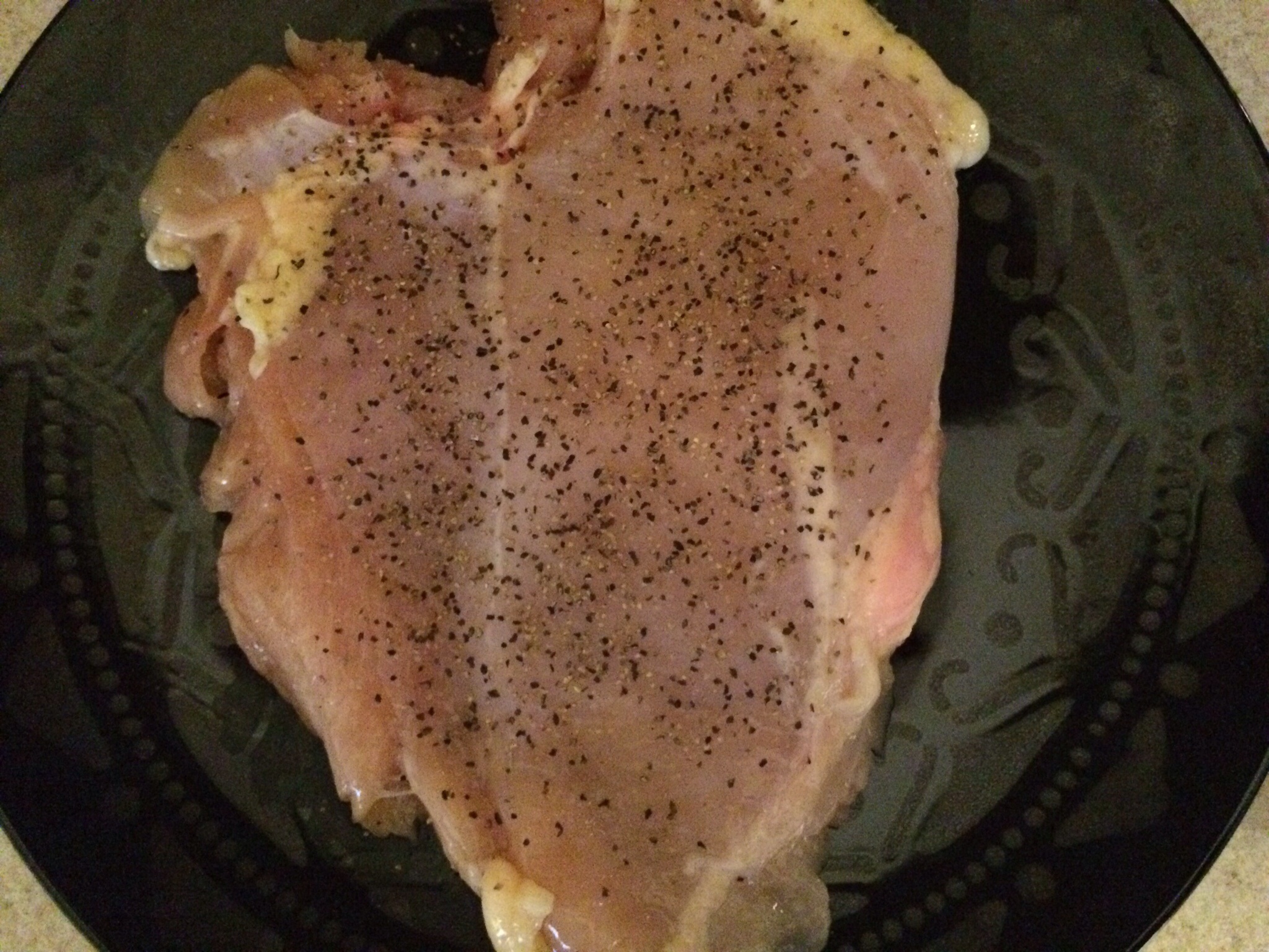 On a plate, working one at a time, place a chicken breast down and sprinkle salt and pepper on inside.