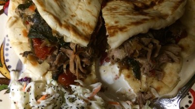 Crockpot Pulled Pork with Vegetables, Flatbread and Tangy Coleslaw