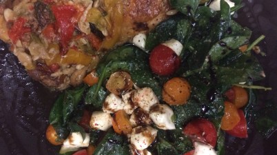 Garlic Chicken with Peppers, Asparagus Served with Spinach, Tomato Mozzarella Salad