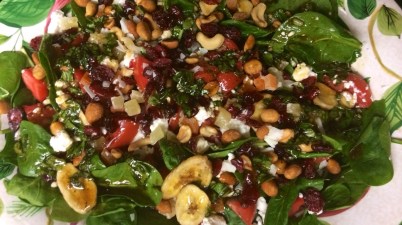 2 bags fresh baby spinach 3 Roma tomatoes, quartered and sliced 4 oz crumbled goat cheese 2 oz chopped red onion (approximately 1/4 of 1 onion) 1 bag Oceanspray Craisins […]