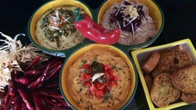 Kalamata Olive Hummus, Roasted Red Pepper Hummus and Garlic Pesto Hummus