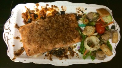 2 large salmon filets, or 4-5 cut salmon pieces 4-5 oz shelled pistachios, chopped in processor or crushed in bag with rolling pin 1 cup Italian bread crumbs 1 […]